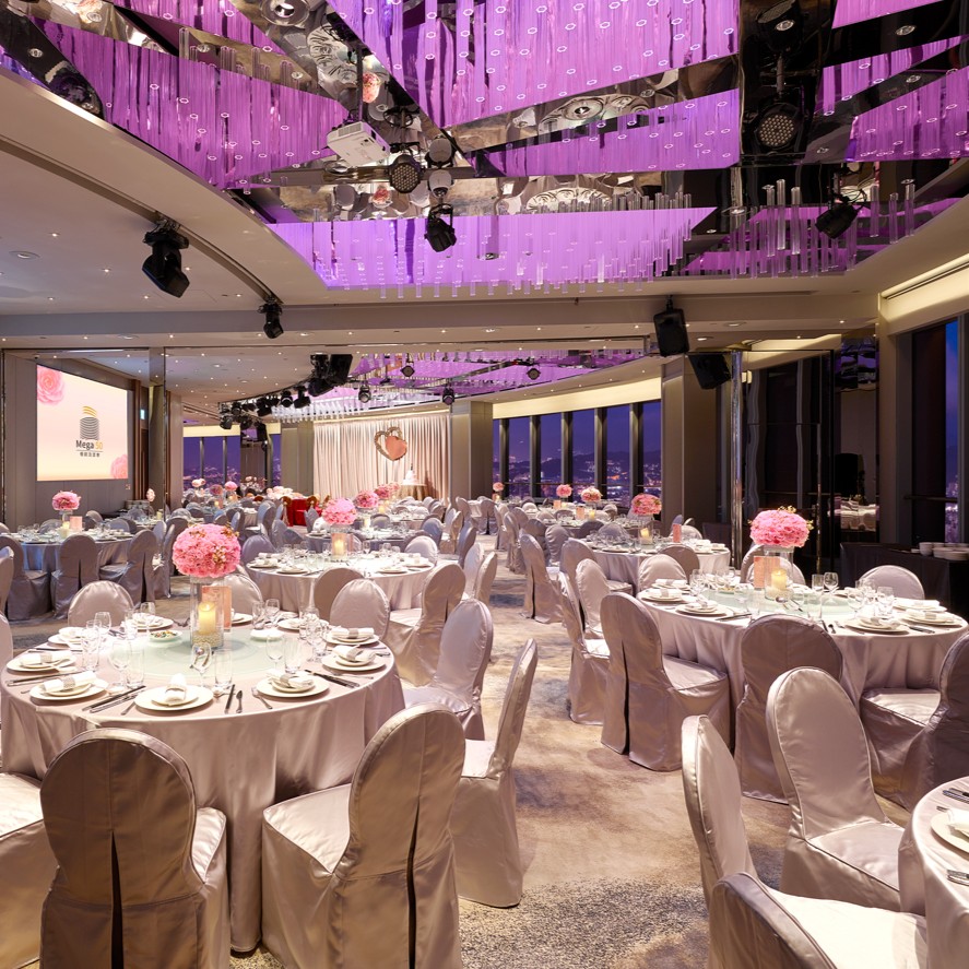 由台北遠東香格里拉飯店負責營運的「Mega50宴會廳」,位於新北地標百揚大樓的48樓,景觀絕佳,毗鄰板橋大遠百,交通便利,是一可容納40桌的宴會場地,華麗氣派、設備齊全,輔以千萬元影音配備同步播放現場實況,整面大片落地窗框住無價自然美景,與廳內典雅氛圍互相輝映!