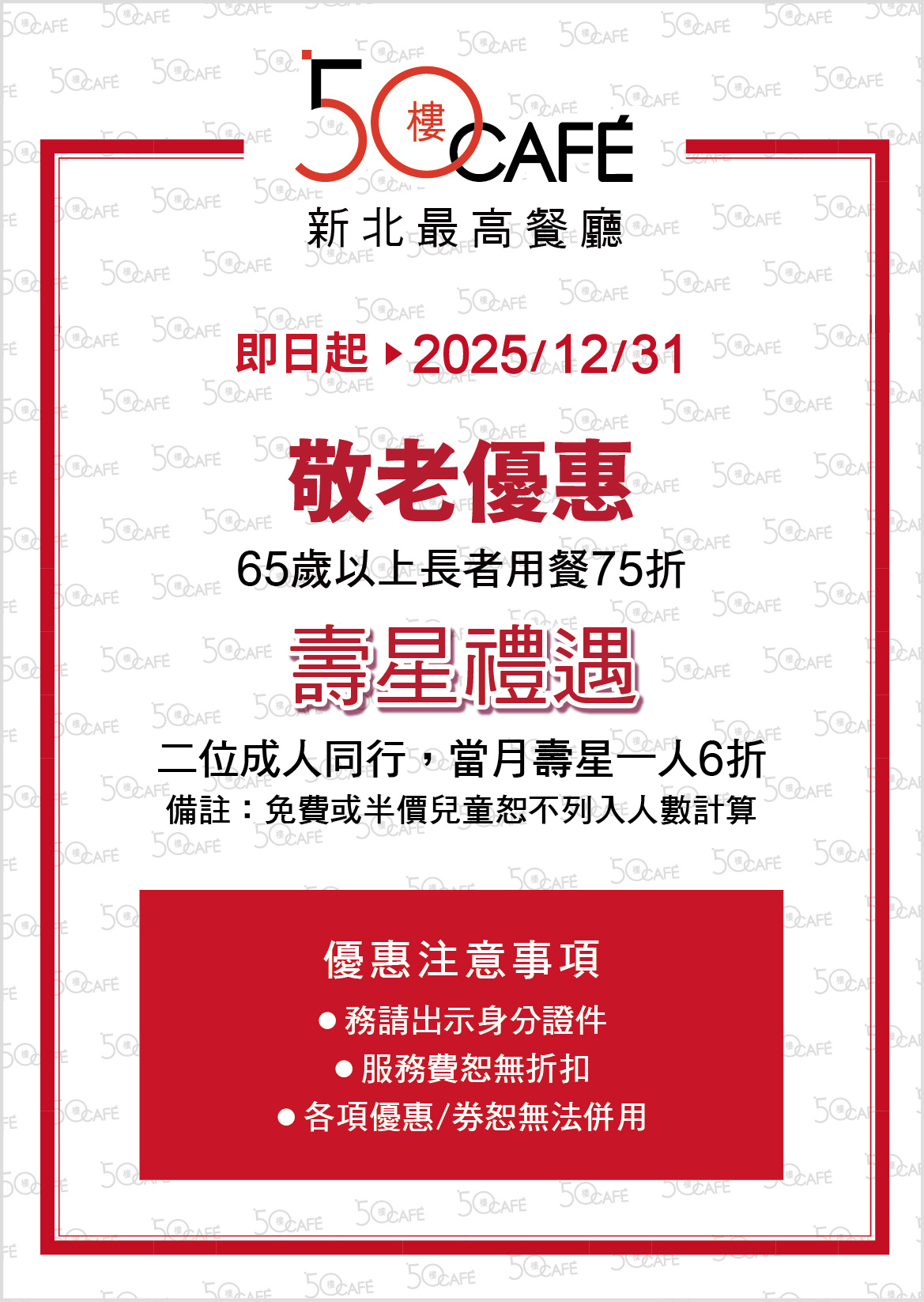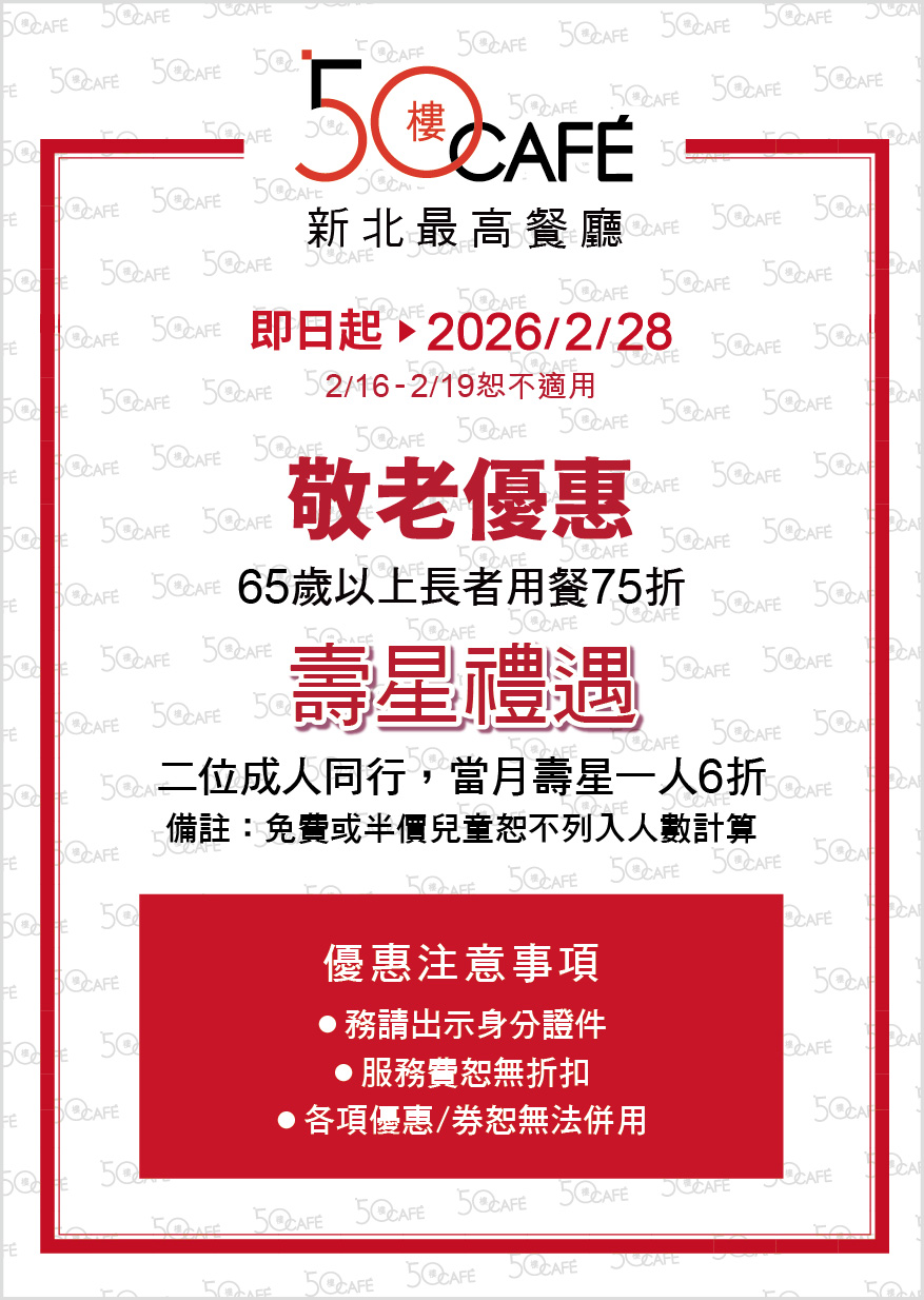 新北最高「50樓Cafe自助餐廳」海陸百匯推陳出新,美食美景同時擁有!餐廳每月提供壽星、長者優惠,歡迎多加利用。訂位請洽(02)7705-9723或線上訂位。獲得最新資訊:+LINE官方帳號或訂閱Mega50電子報