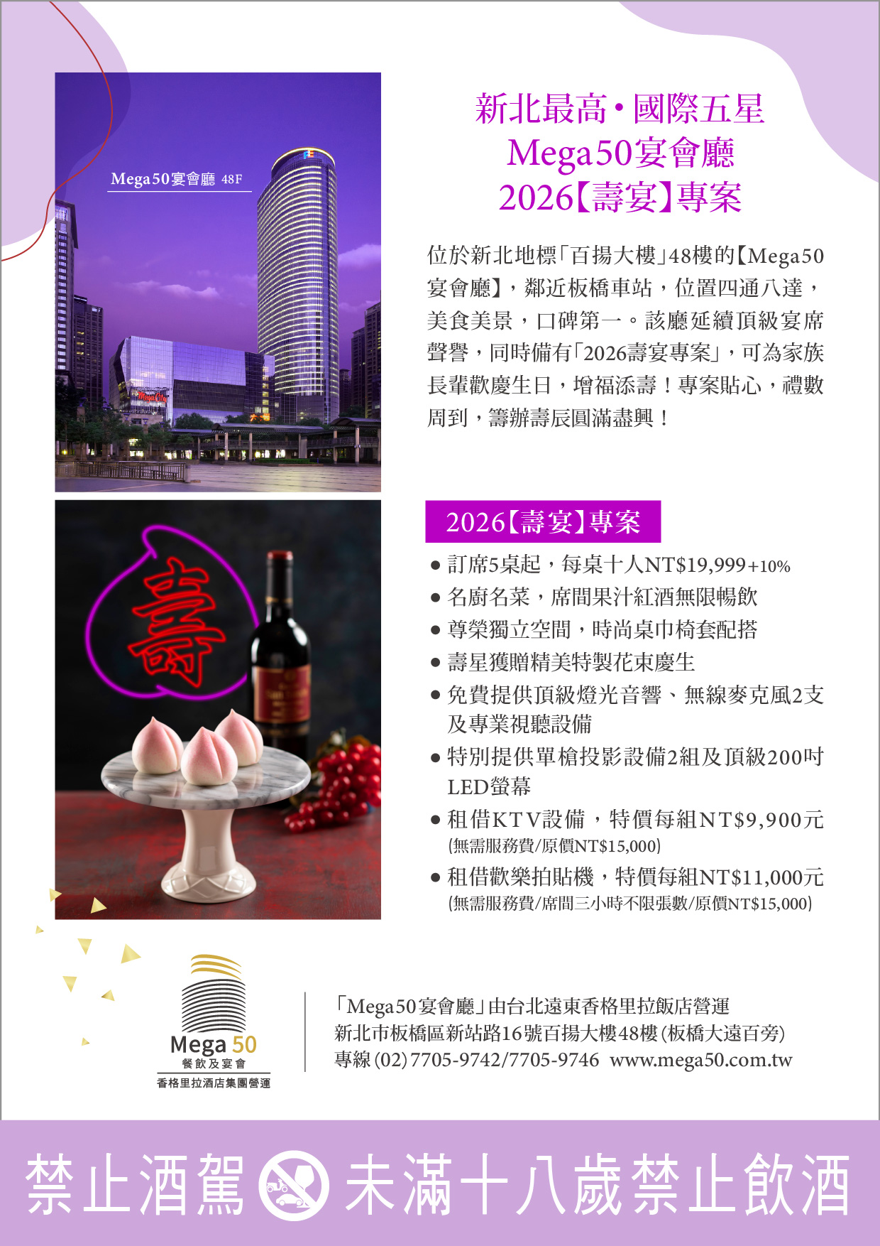 且讓我們為年歲戴上尊貴的冠冕!一場圓滿如意的生日壽辰,就交給Mega50宴會廳!美食盡興,美景怡情,美好瞬間精彩難忘!訂席請洽(02)7705-9742、7705-9746或線上填寫訂席需求。獲得最新資訊:+LINE官方帳號或訂閱Mega50電子報