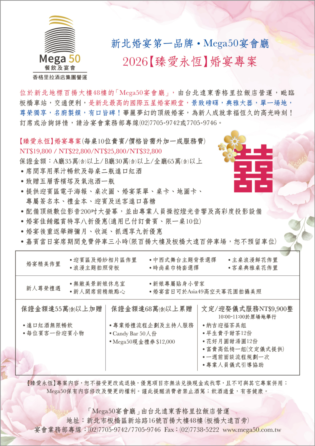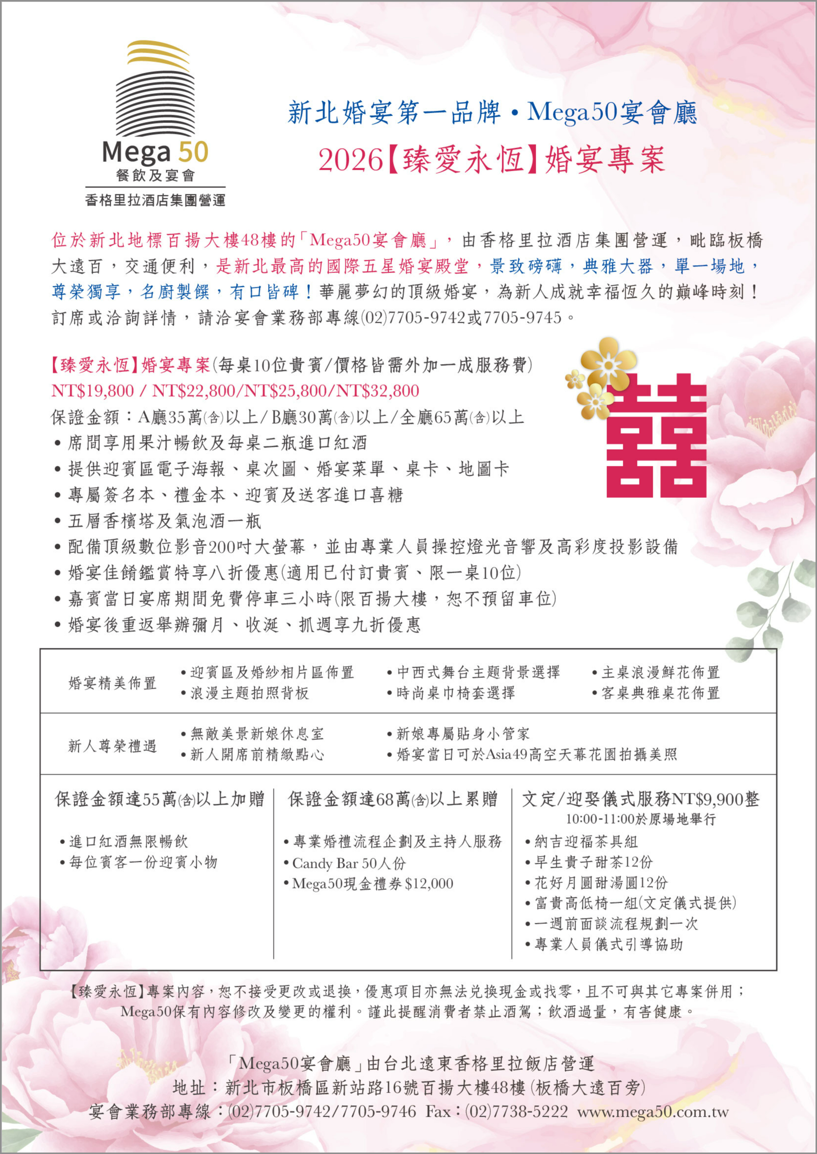 由台北遠東香格里拉飯店營運的「Mega50宴會廳」(48F),是新北最高的五星婚宴殿堂,景致磅礴,典雅大器,宴席精美,單一場地,尊榮獨享,以頂級浪漫婚宴為新人見證幸福恆久時刻!詳情請洽業務部專線(02)7705-9742、7705-9746或線上填寫訂席需求。