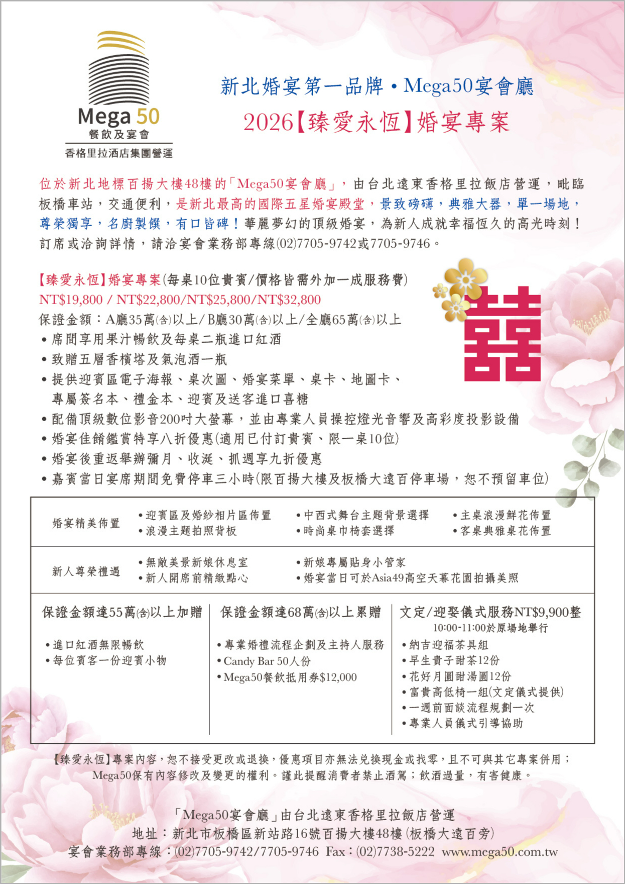 由台北遠東香格里拉飯店營運的「Mega50宴會廳」(48F),是新北最高的五星婚宴殿堂,景致磅礴,典雅大器,宴席精美,單一場地,尊榮獨享,以頂級浪漫婚宴為新人見證幸福恆久時刻!詳情請洽業務部專線(02)7705-9742、7705-9746或線上填寫訂席需求。獲得最新資訊:+LINE官方帳號或訂閱Mega50電子報