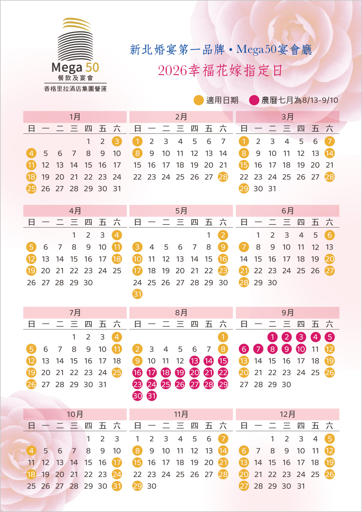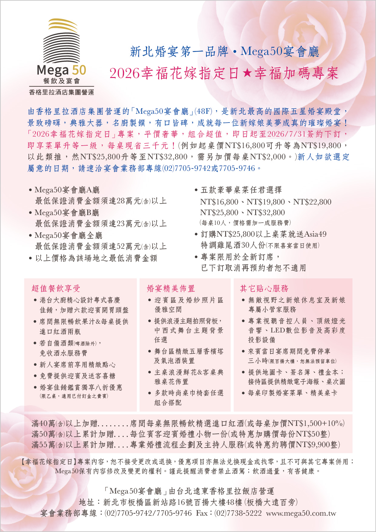 「2026幸福花嫁指定日」特惠婚宴專案,平價奢華,組合超值,2026/7/31以前簽約下訂,就享菜色升等一級,每桌現省三千元!歡迎電洽宴會業務部專線(02)7705-9742、7705-9746或線上填寫訂席需求。獲得最新資訊:+LINE官方帳號或訂閱Mega50電子報