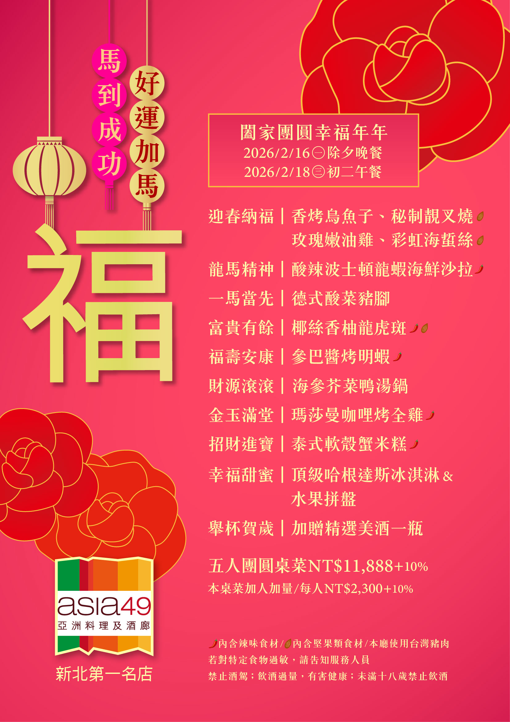 ♦2/16(一/除夕)至2/20(五/大年初四):午餐11:30-15:00;晚餐18:00-22:30