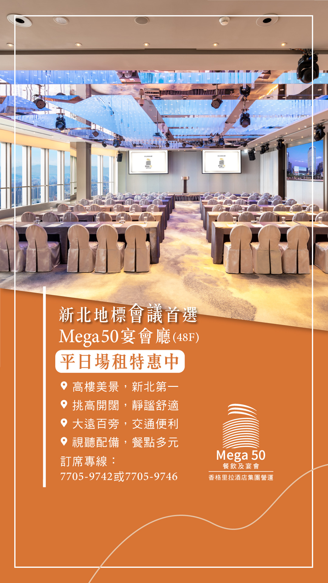 位於新北地標百揚大樓48樓的「Mega50宴會廳」,由台北遠東香格里拉飯店營運,坐擁 360度環場視野,備有專業視聽設施,且鄰近板橋車站,交通極為便利,為新北市首選的會議場地,即日起推出平日場租優惠,詳洽(02)7705-9742、7705-9746或線上填寫訂席需求。