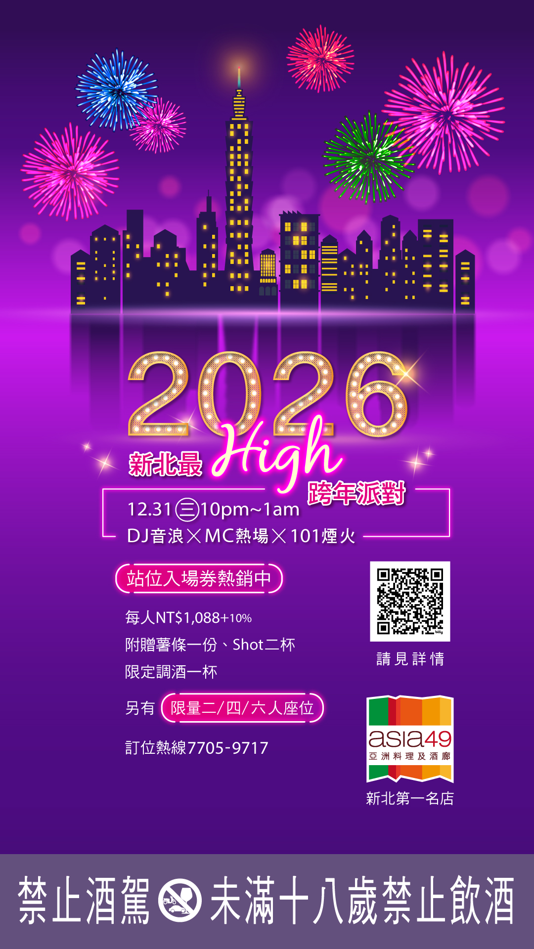 被網友稱為坐擁媲美曼哈頓夜景的「Asia49亞洲料理及酒廊」,位於新北地標百揚大樓的49樓,延續以往的好口碑,12月31日(週三)晚間10點至次日凌晨1點將推出「2026新北最High跨年派對」,以傲視同業的無遮蔽超廣角視野,盡攬雙北城廓、淡水河岸以及台北101璀璨煙火美景,加上美酒炸物、DJ嗨秀、MC串場,全廳熾熱歡鬧,是新北市絕無僅有的超搶手跨年派對活動!細節如下,訂席熱線(02)7705-9717、7705-9718。