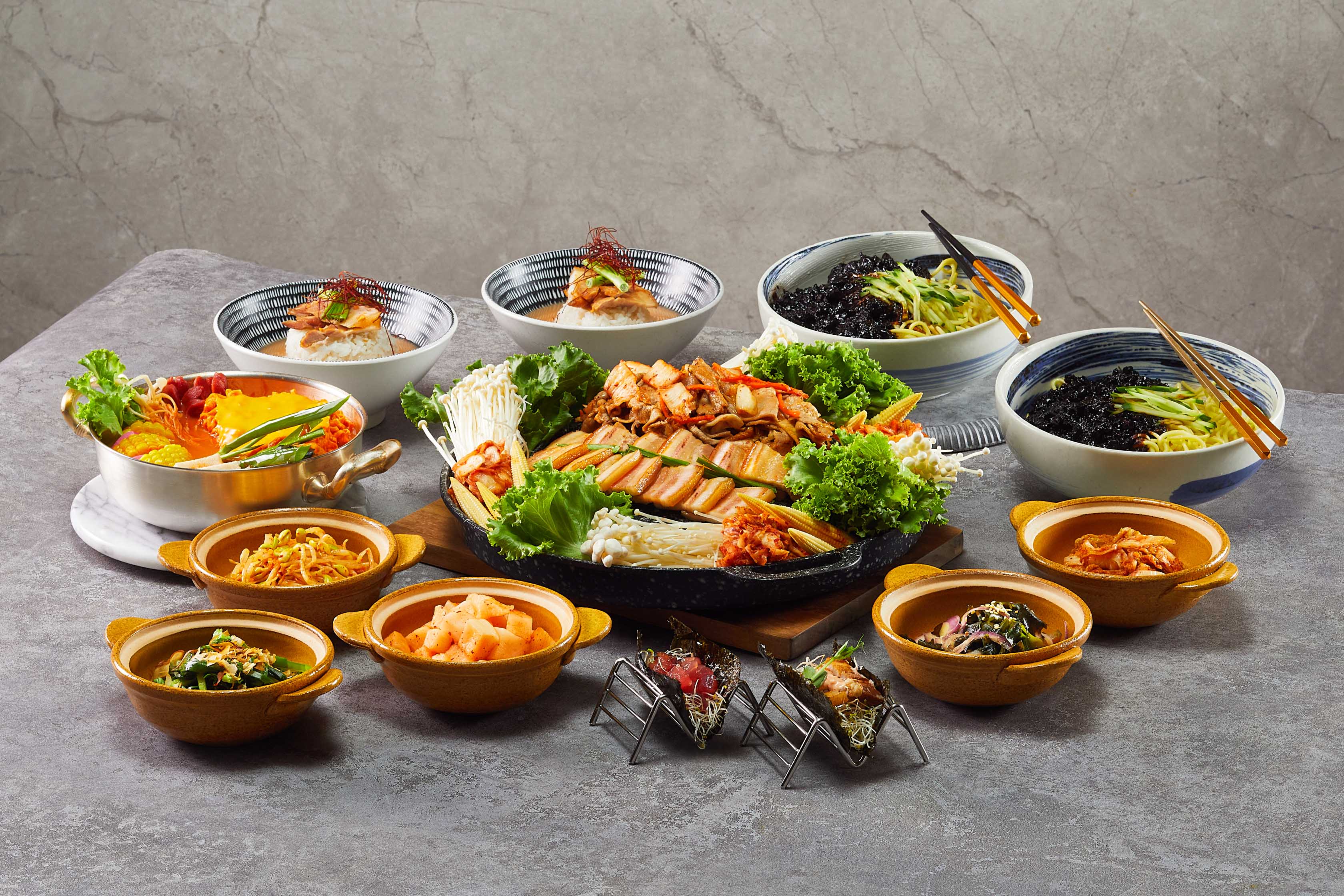 超夯韓流美食怎能少了「韓國烤肉」!特選油花豐潤的帶皮豬五花及肥瘦均勻的豬梅花兩種部位,先醃再炙烤到香氣四溢,搭配泡菜、醃蘿蔔、黃豆芽各種傳統韓式小菜更對味!現煮餐檯區的「部隊鍋」湯底融合韓國大醬、辣醬、雞高湯與泡菜汁熬煮,再加入年糕、魚板、蔬菜、泡麵、起司等豐富食材,爽辣開胃。「韓式炸醬麵」以正宗韓國春醬加豬絞肉炒製醬料,滋味鹹甜交融。其它像是以豬大骨結合辣醬熬出醇厚湯頭的「豬肉湯泡飯」,或是以泡菜豬五花、醬拌鮪魚變身的風味手卷,也都推薦一嚐。