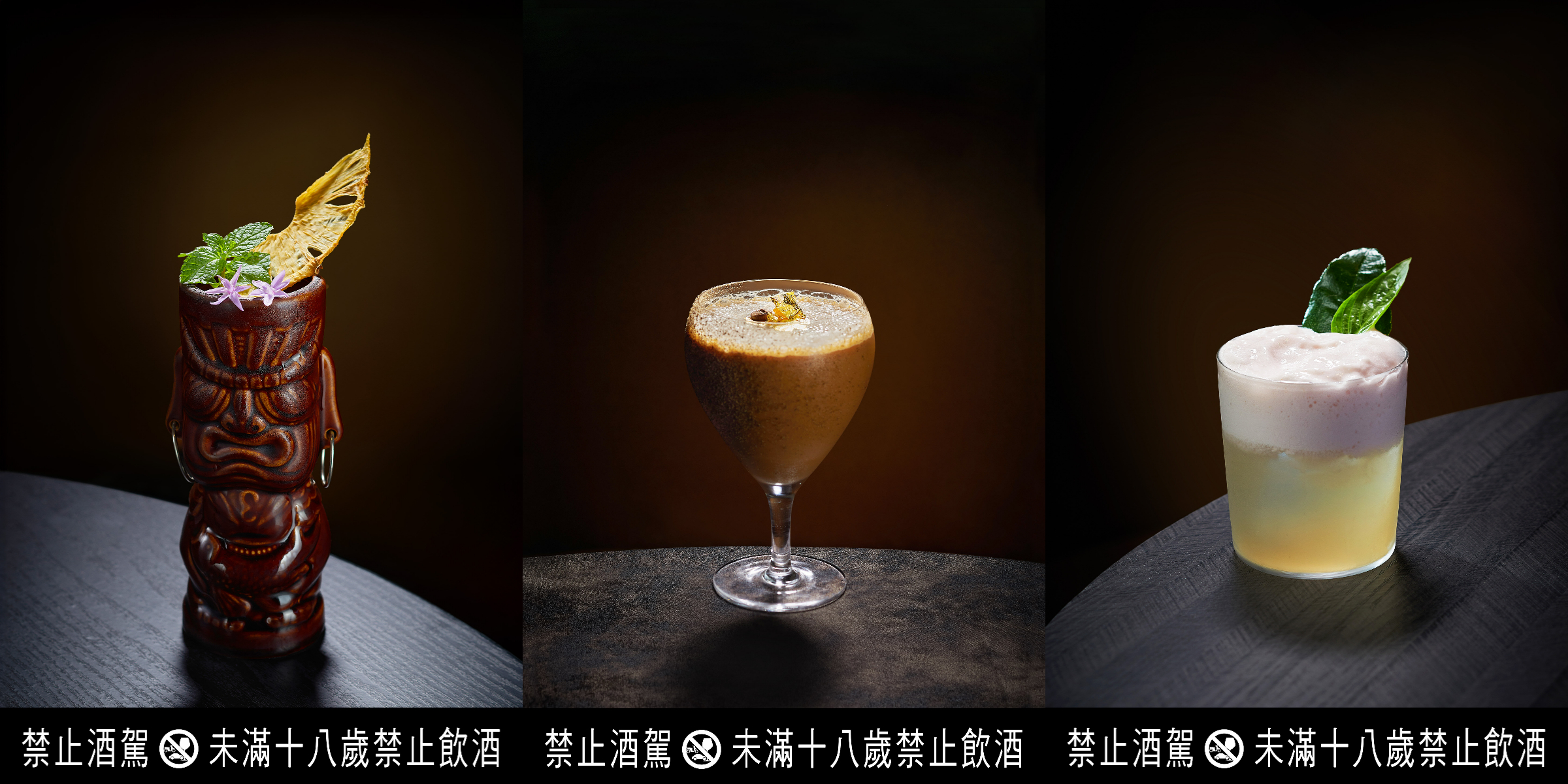 「泰風果語(NT$400,下圖左)」取香茅、鳳梨、芒果等食材混入飽滿奔放的蘭姆酒中,品飲時彷彿嚐到泰國芒果糯米飯般,香濃甜蜜。「肆玖茶室(NT$450,下圖中)」以香港的鴛鴦奶茶為發想,將琴酒調和焙茶、咖啡、阿華田、奶水,打造甜點版的咖啡馬丁尼。「南國遊記(NT$450,下圖右)」用浸泡斑蘭葉的蘭姆酒及法勒南香甜酒構築酒體深度,疊加椰奶、檸檬葉,熱帶氣息縈繞,濃縮了越南的午後時光。