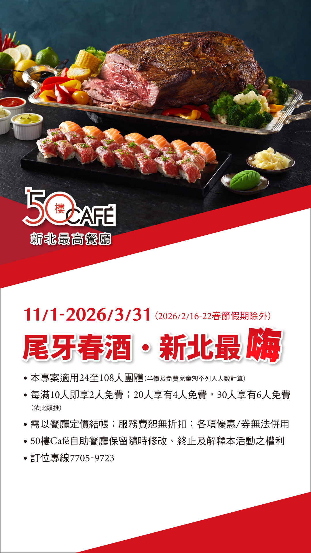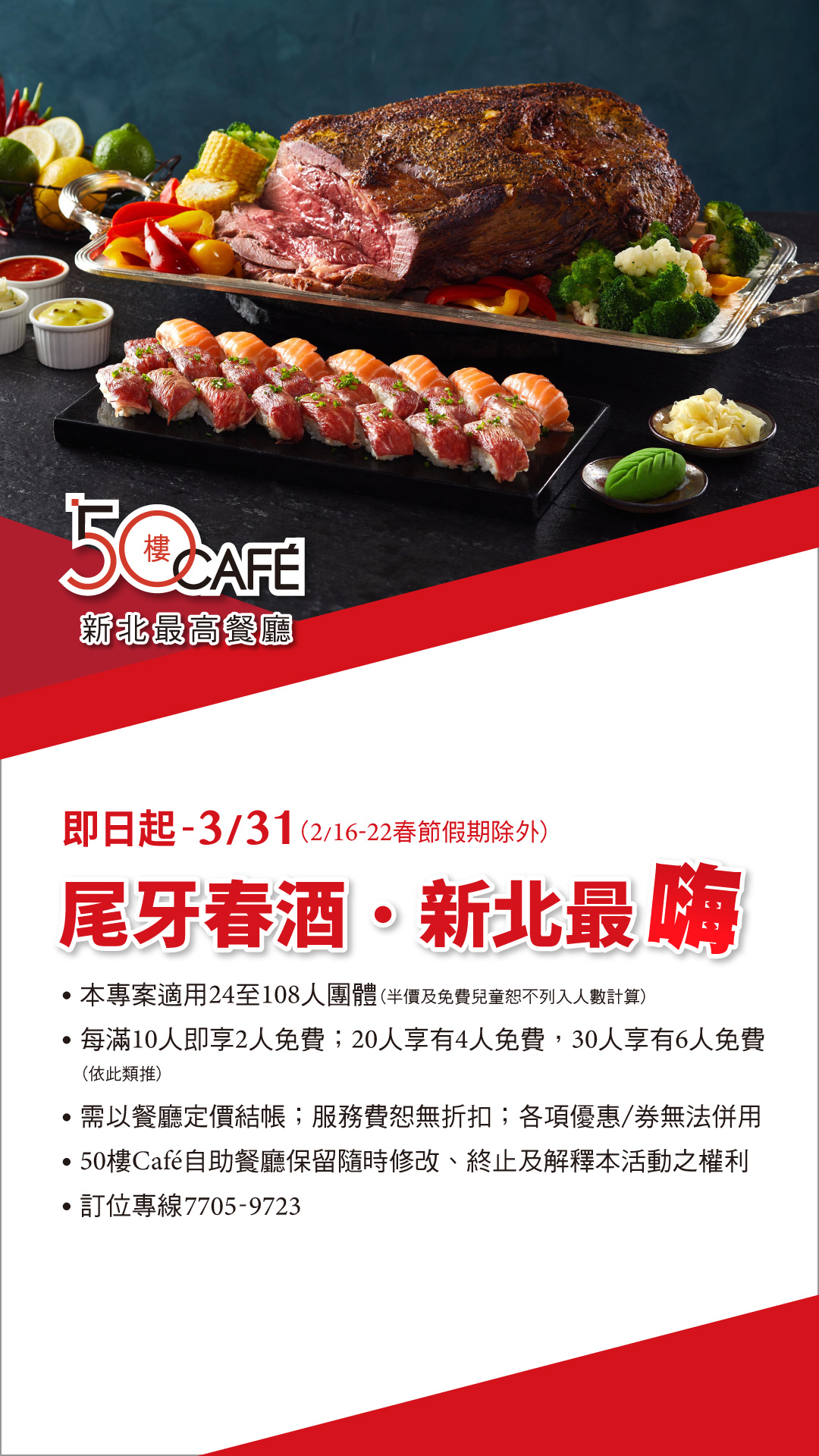 新北最高「50樓Café自助餐」(50F),坐擁環場無邊視野和琳瑯佳餚美點,是公司行號年終酬謝同仁的聚餐首選,在城市之巔舉杯同樂!訂位請洽(02)7705-9723或線上訂位。