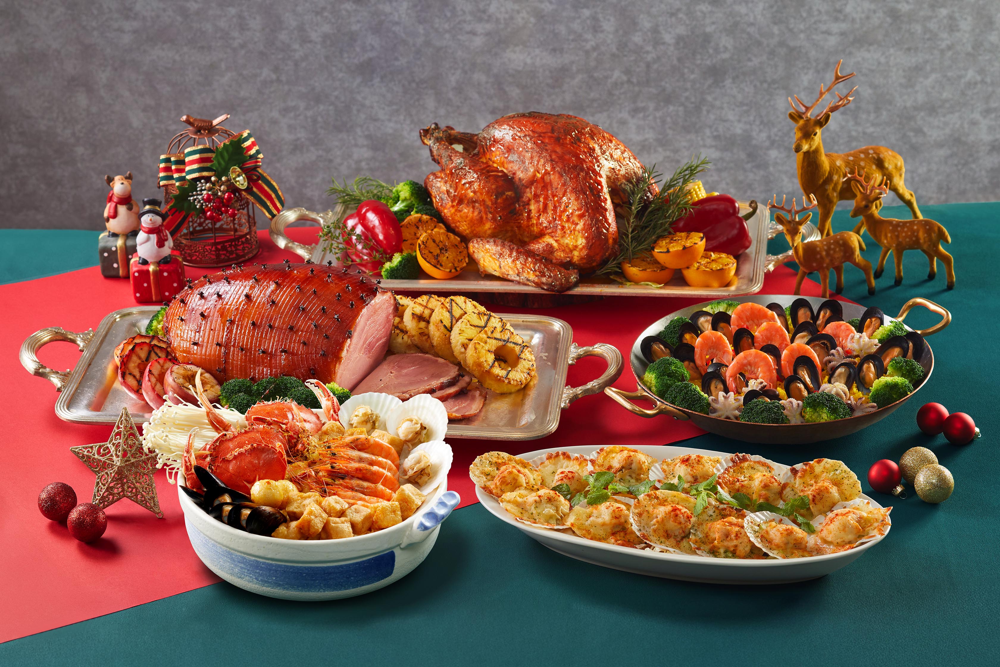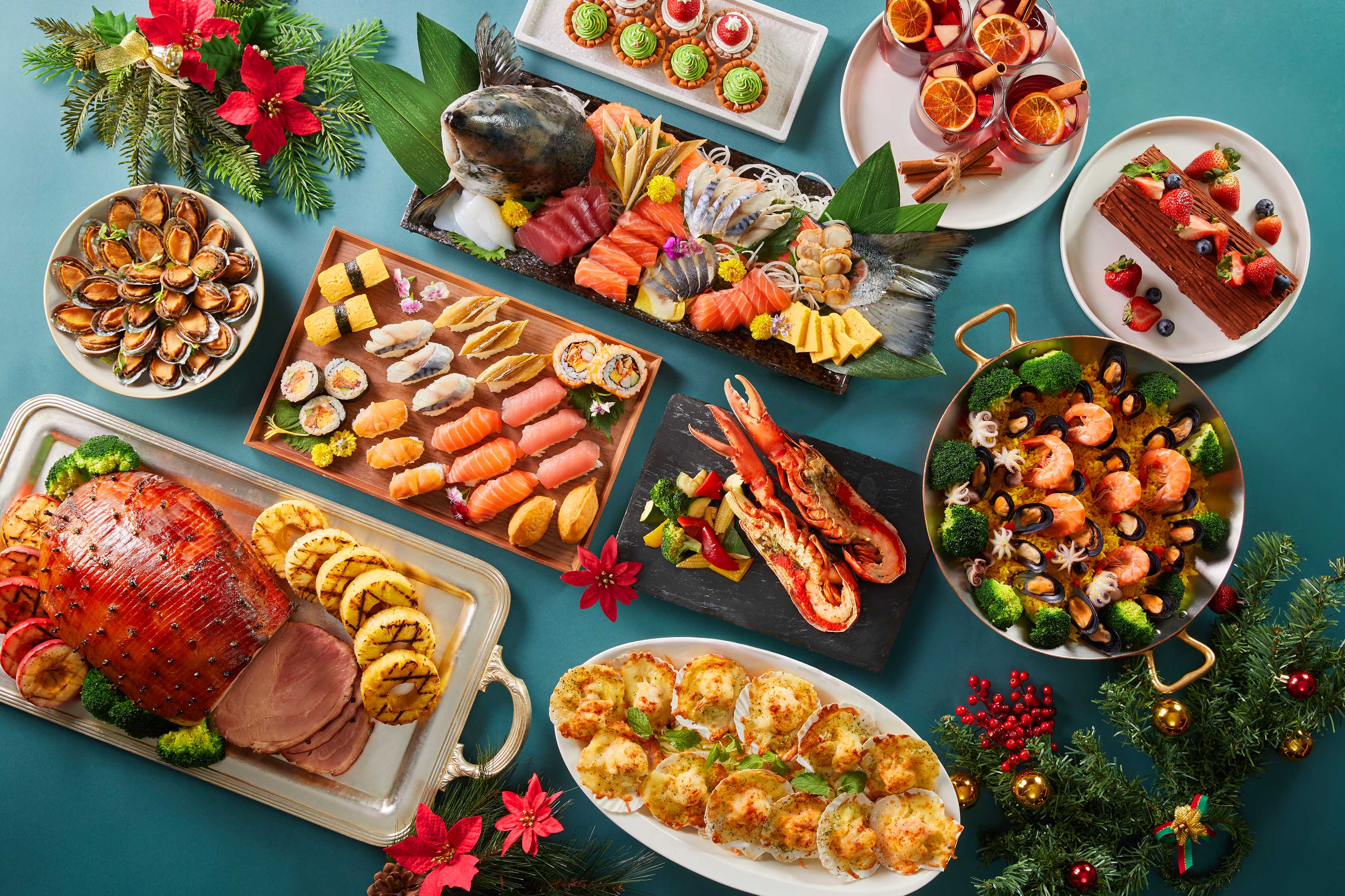 熱食區集結多國人氣料理,「焗烤扇貝」結合自製白醬與莫札瑞拉、切達起司焗烤,金黃牽絲,香濃滑順。「西班牙海鮮飯」及「叻沙海鮮鍋」都加入蝦、蟹、淡菜、章魚等豐富配料,前者還以加了番紅花的海鮮高湯煮熟生米,香氣四溢;後者則融合香茅、南薑、椰漿與蝦高湯熬製湯底,濃郁香醇,還原道地南洋風情。週五晚餐、週六日全天及特殊節日(12/24晚餐、12/25全天、12/31晚餐)更加碼耶誕跨年大餐,除了應景的「聖誕火雞佐莓果醬」、「現切香料火腿」輪番上桌,每人還可獨享焗烤波士頓龍蝦半隻,打造濃濃佳節氛圍。
