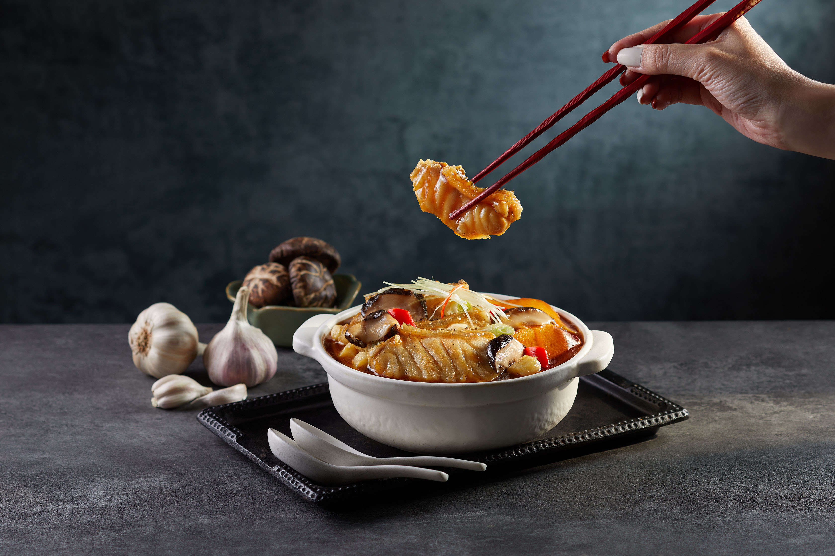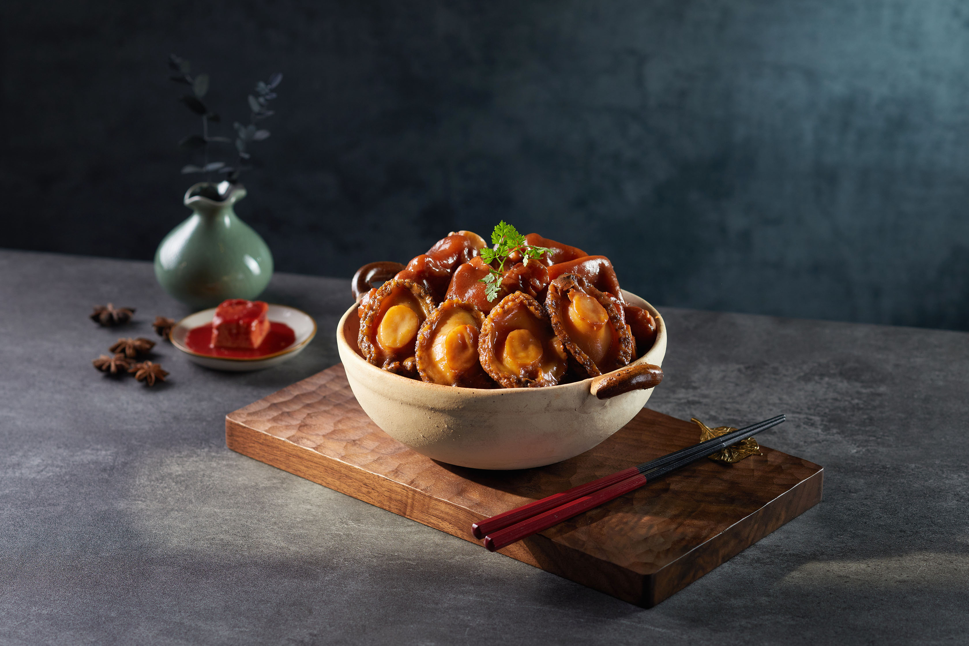邱主廚表示,粵菜中「南乳燜豬手」與「豬蹄燒鮑魚」是冬季常見補身料理,他以此為靈感,融合二者並選用新北在地水產貢寮鮑,以「南乳貢寮鮑燜豬腳」(NT$1,280)呈現豐富膠質與鮮美海味的華麗組合。豬前腳中段炸香、鮑魚以蔥薑水汆燙,入砂鍋與南乳、麥芽糖、紹酒、米酒、醬油及八角、花椒、月桂葉、辣椒等多種香料燜燒入味,豬腳油潤、鮑魚彈牙,讓人食指大動。