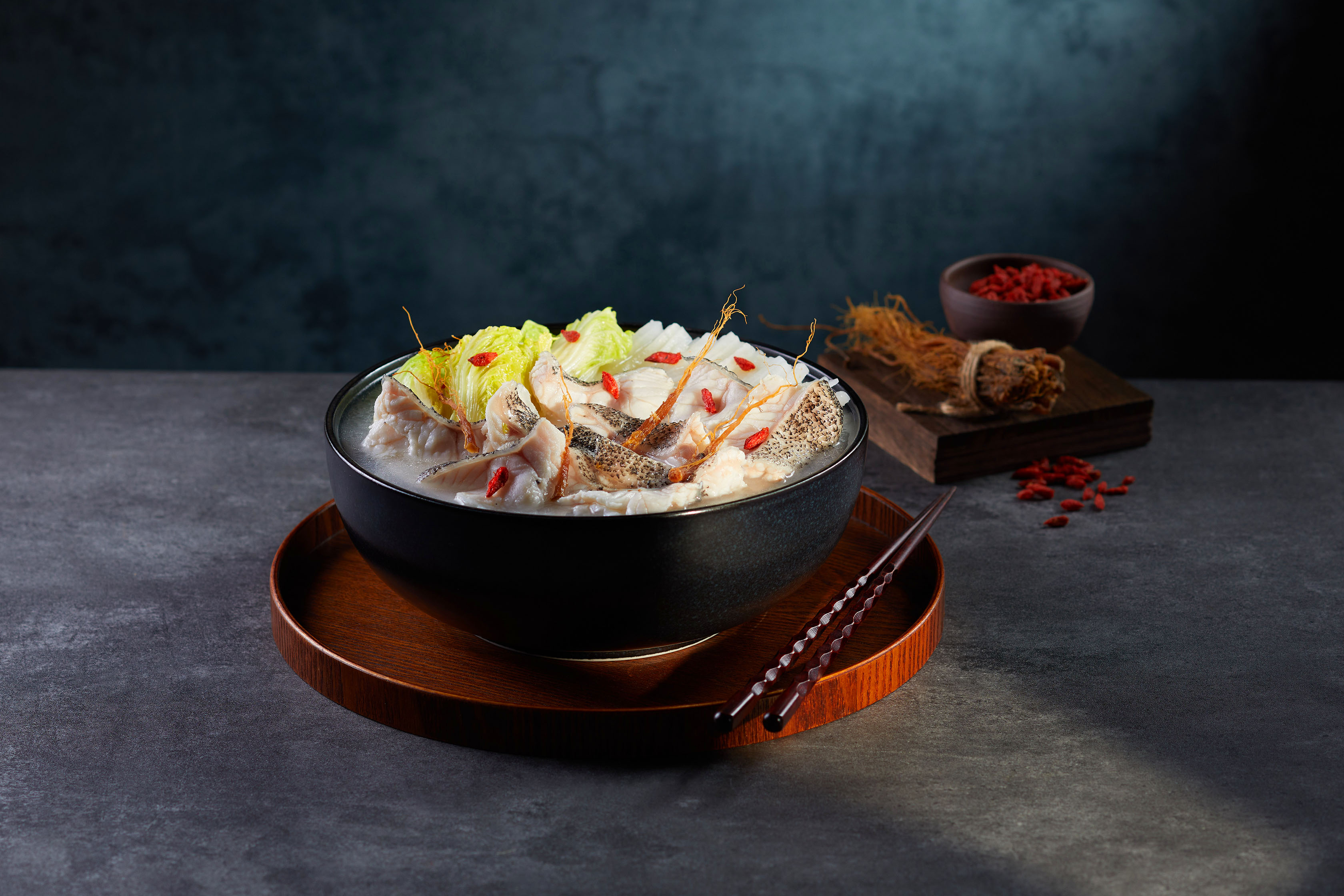 「紅蔘龍虎斑魚湯」(NT$880)則以鮮活龍虎斑為主角,現殺片下魚肉,抓醃備用;湯頭採港式作法,魚骨炸得酥香後加熱水、薑片大火熬煮,再搗碎魚骨續煮至膠質釋放、湯色轉為濃白。以此濾出的魚湯為底,將浸泡兩日米酒的紅蔘鬚連同酒液倒入鍋中,再下魚片、白蘿蔔、枸杞,魚肉細嫩爽口,湯韻豐厚卻清甜回甘。