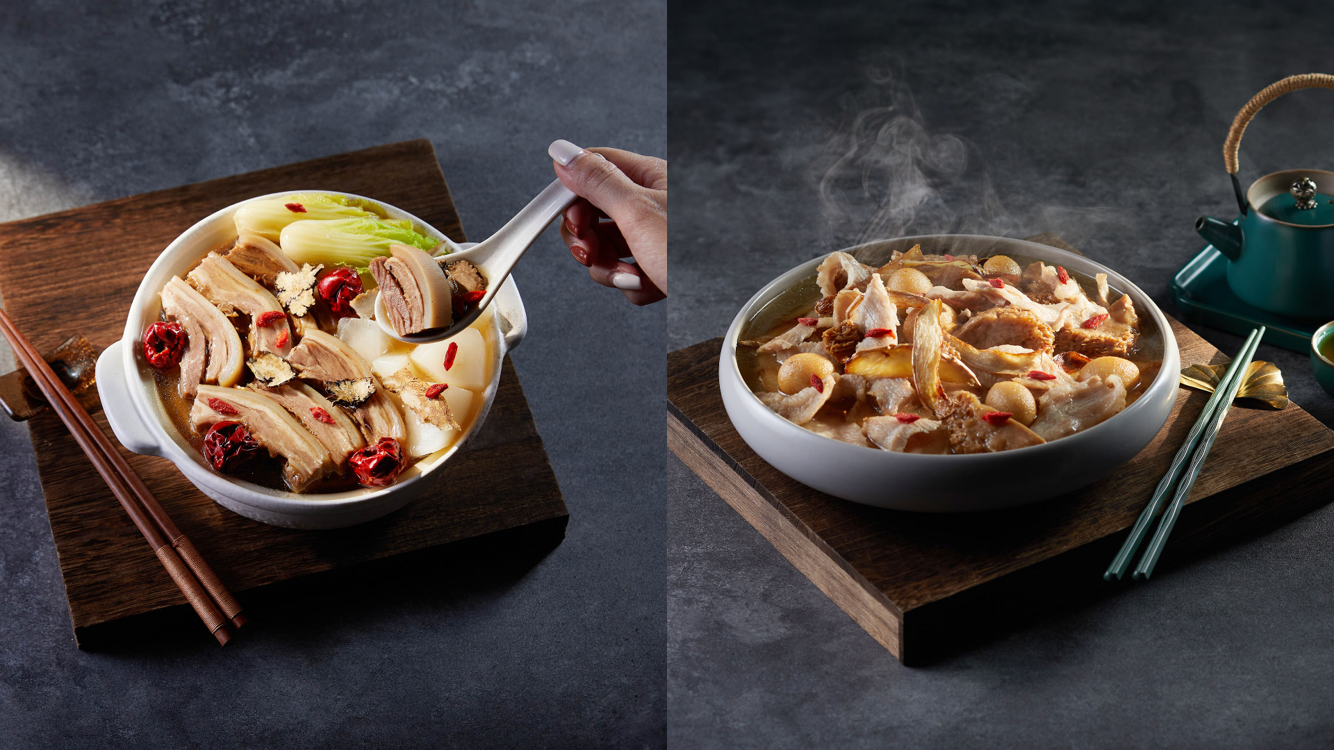 融入台味的暖胃料理則有「當歸藥膳羊腩煲」(NT$880,下圖左)及「麻油松阪豬燴猴頭菇」(NT$580,下圖右),前者特選產自澳洲、油脂分布最均勻的中段帶皮羊腩,先以花椒、八角與米酒汆燙備用;小火炒出當歸、川芎、老薑香氣,再放入羊肉翻炒至金黃飄香。將之移至砂鍋加少許高湯燜煮,續加白蘿蔔、娃娃菜、紅棗、枸杞收汁,軟嫩羊腩交織中藥香與油脂香,惹味至極。後者的風味核心來自北港純黑麻油,先低溫煸香老薑,再放入肉質嫩中帶脆的松阪豬炒香,加米酒、高湯,與炸鵪鶉蛋、泡發的猴頭菇燒煮,香氣四溢,馥郁迷人。
