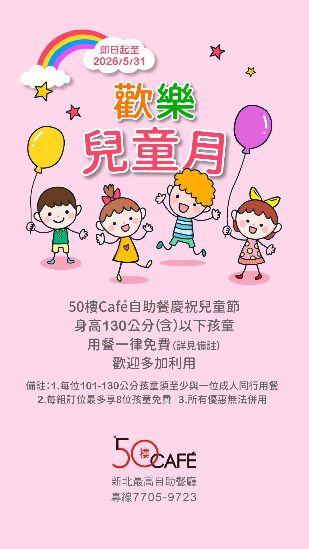 歡慶兒童節,即日起至5/31於「50樓Café自助餐廳」用餐,身高130公分以下(含)孩童一律免費!每位101-130公分孩童須至少與一位成人同行用餐,每組訂位最多享8位孩童免費,所有優惠無法併用。訂位請洽(02)7705-9723或線上訂位。