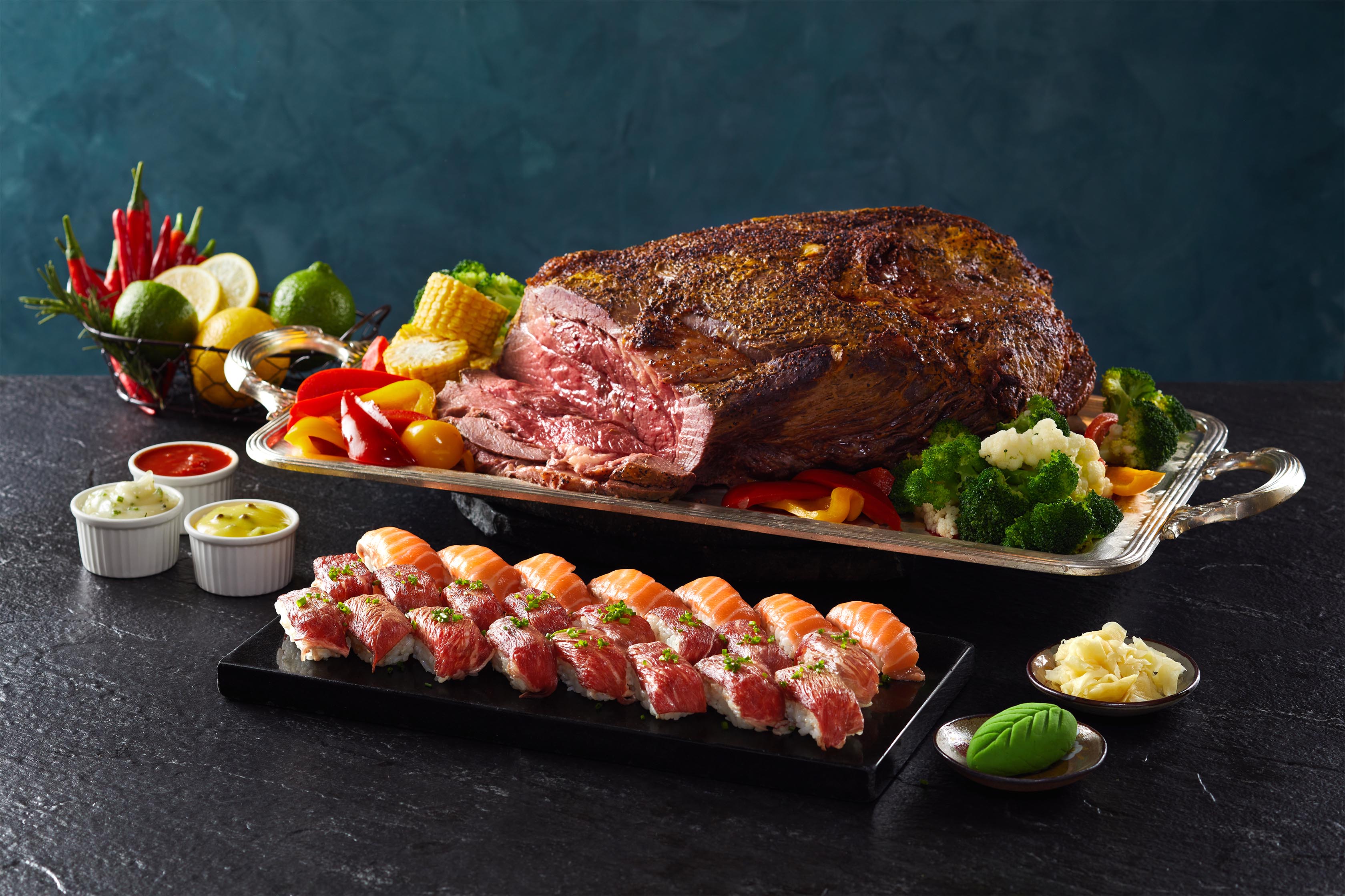 50樓Café特選美國知名蛇河農場(SRF)的極黑和牛,是由日本和牛與美國安格斯黑牛混種培育、且經長達600天(是一般牛隻的四倍)的穀飼養成,大理石油花豐沛密布,更有安格斯牛獨特的濃郁肉味。「爐烤和牛」採用重達9公斤的極黑和牛肉,以黃芥末混入多種香料醃漬整夜,再悉心烤至完美熟度,分切時香氣四溢,肉質紅潤,鮮嫩多汁,搭配黑胡椒醬、紅酒醬或烤大蒜,更添誘人風味。日式餐檯也端出「炙燒和牛握壽司」,經過火吻的肉片滲出焦香油脂,滑嫩化口,搭配酸甜的醋飯,層次鮮明又完美交融。