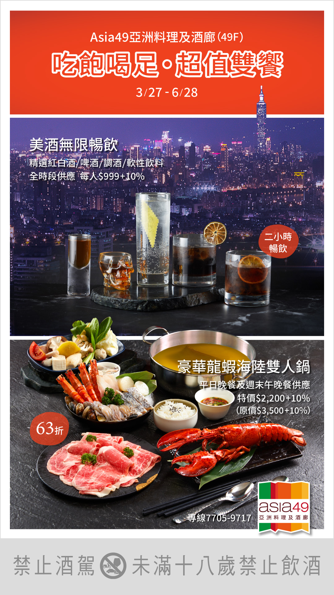 坐擁360度高空景致的新北最高餐酒館「Asia49亞洲料理及酒廊」,3/27-6/28推出「吃飽喝足‧超值雙饗」特惠,豪華海陸火鍋、酒類暢飲活動同步登場,美食、美酒、美景一次滿足!訂位請洽(02)7705-9717、7705-9718或線上訂位。