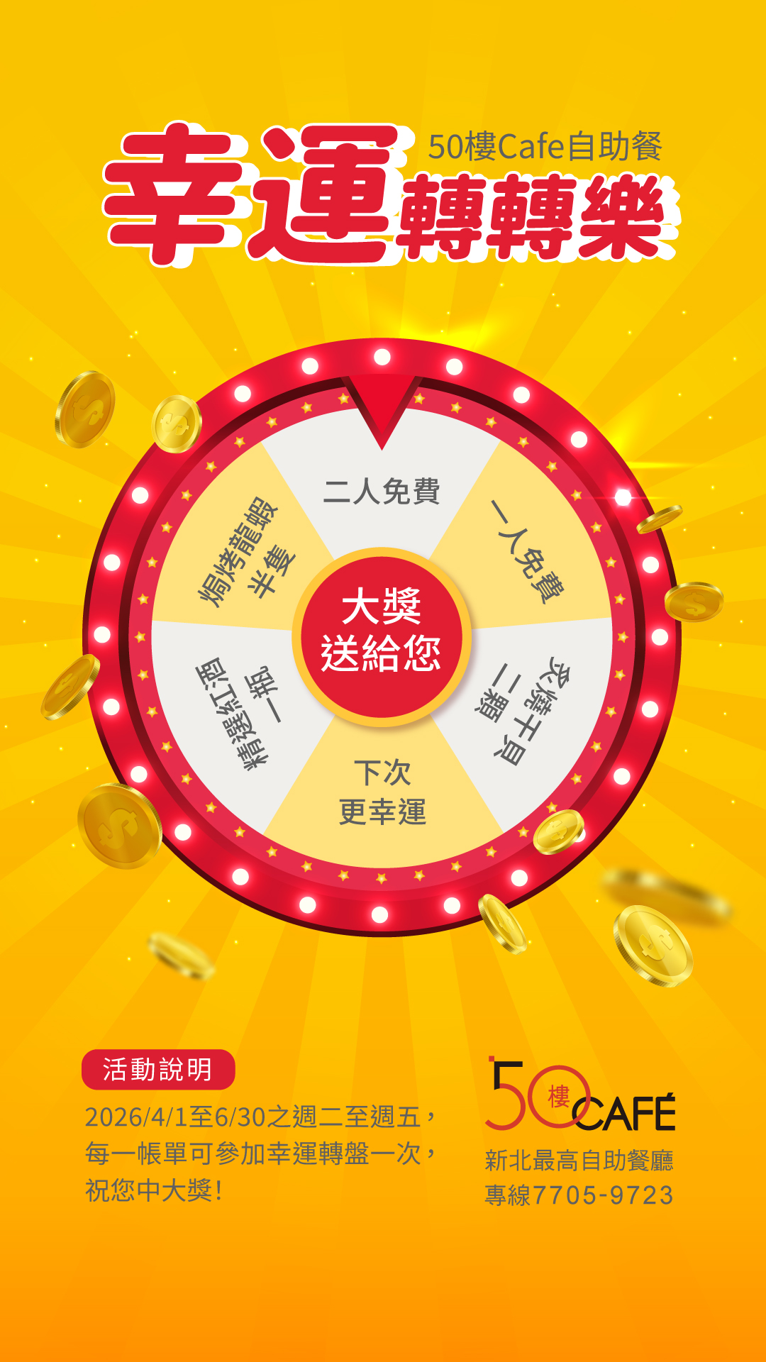 為回饋賓客,新北最高「50樓Café自助餐廳」推出「幸運轉轉樂」活動,4/1-6/30週二至週五用餐,每一帳單可參加幸運轉盤一次,有機會獲得二人免費用餐、焗烤龍蝦等好禮!訂位速洽(02)7705-9723、7705-9724或線上訂位。